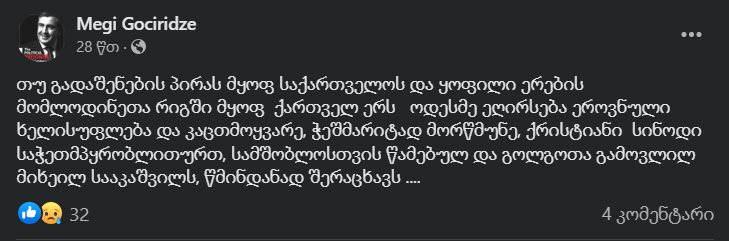 “თუ გადაშენების პირას მყოფ საქართველოს და ყოფილი ერების მომლოდინეთა რიგში მყოფ ქართველ ერს ოდესმე ეღირსება ეროვნული ხელისუფლება და კაცთმოყვარე, ჭეშმარიტად მორწმუნე, ქრისტიანი სინოდი საჭეთმპყრობლითურთ, სამშობლოსთვის წამებულ და გოლგოთა გამოვლილ მიხეილ სააკაშვილს, წმინდანად შერაცხავს”– წერს მეგი გოცირიძე.
