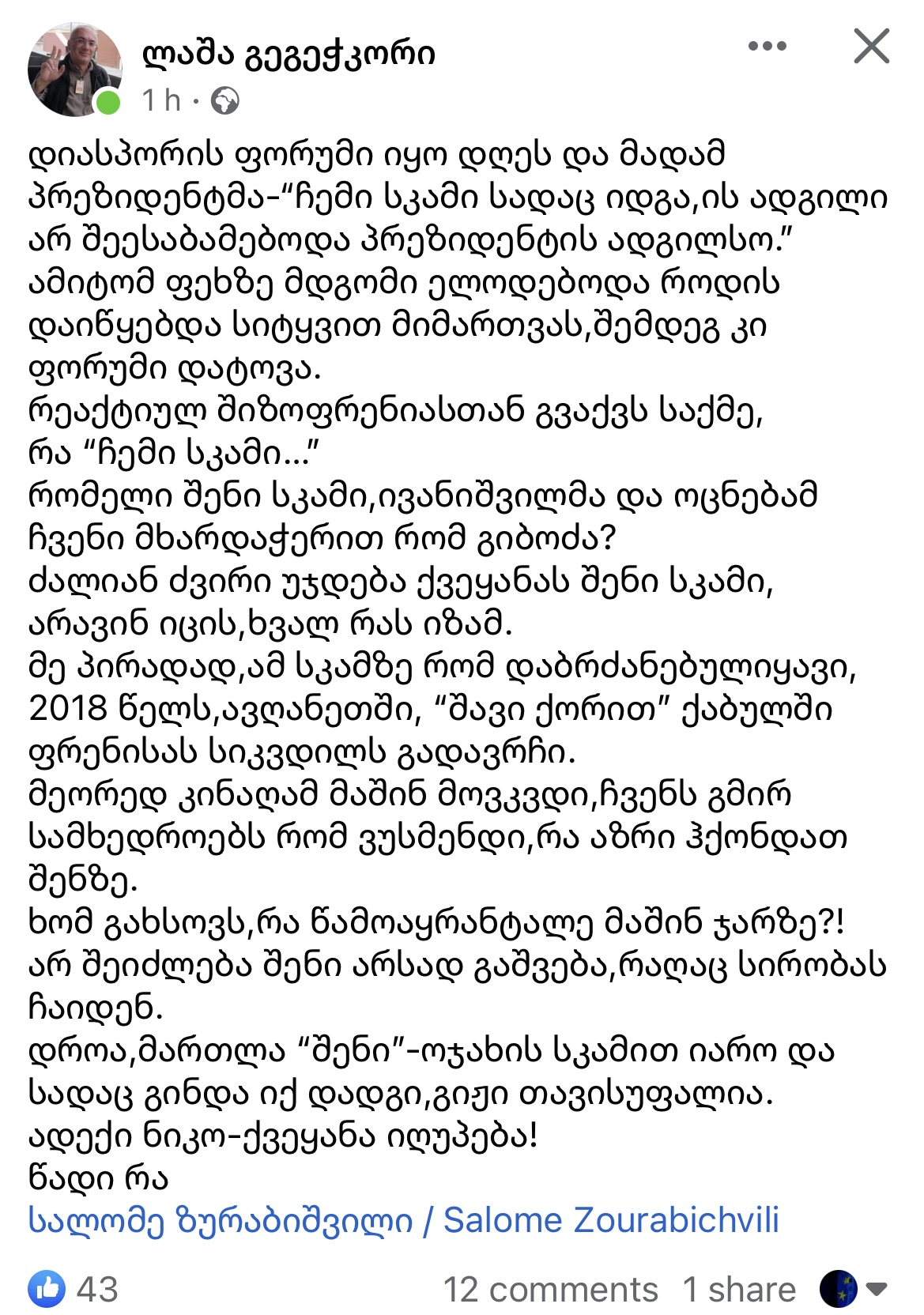 “დიასპორის ფორუმი იყო დღეს და მადამ პრეზიდენტმა-“ჩემი სკამი სადაც იდგა,ის ადგილი არ შეესაბამებოდა პრეზიდენტის ადგილსო.”