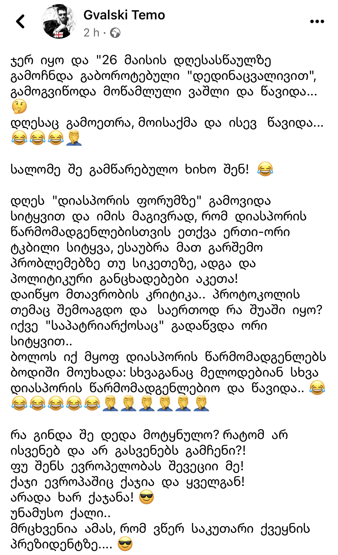 თემურ გვალია სოციალურ ქსელში პოსტს აქვეყნებს, რომელსაც უცვლელად გთავაზობთ.