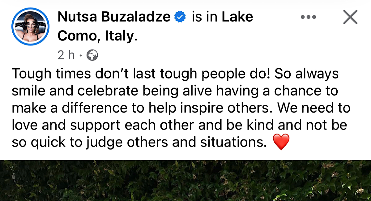 მომღერალი ნუცა ბუზალაძე, რომელიც ბოლო დღეებში, მოსკოვში ერთ-ერთ წვეულებაზე სიმღერის გამო საზოგადოების ნაწილი აკრიტიკებს, იტალიაში, კომოს ტბაზე იმყოფება. ამის შესახებ “ფეისბუქში” მისი ოფიციალური გვერდიდან ხდება ცნობილი. ნუცა კომოს ტბიდან ფოტოს აქვეყნებს და წერს, რომ რთული პერიოდი დიდხანს არ გრძელდება.