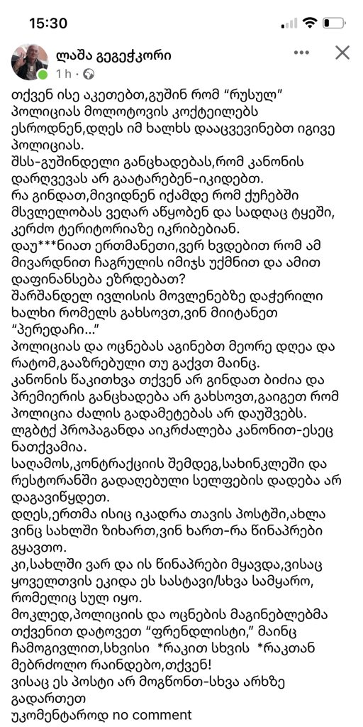 ლაშა გეგეჭკორი სოციალურ ქსელში პოსტს აქვეყნებს.