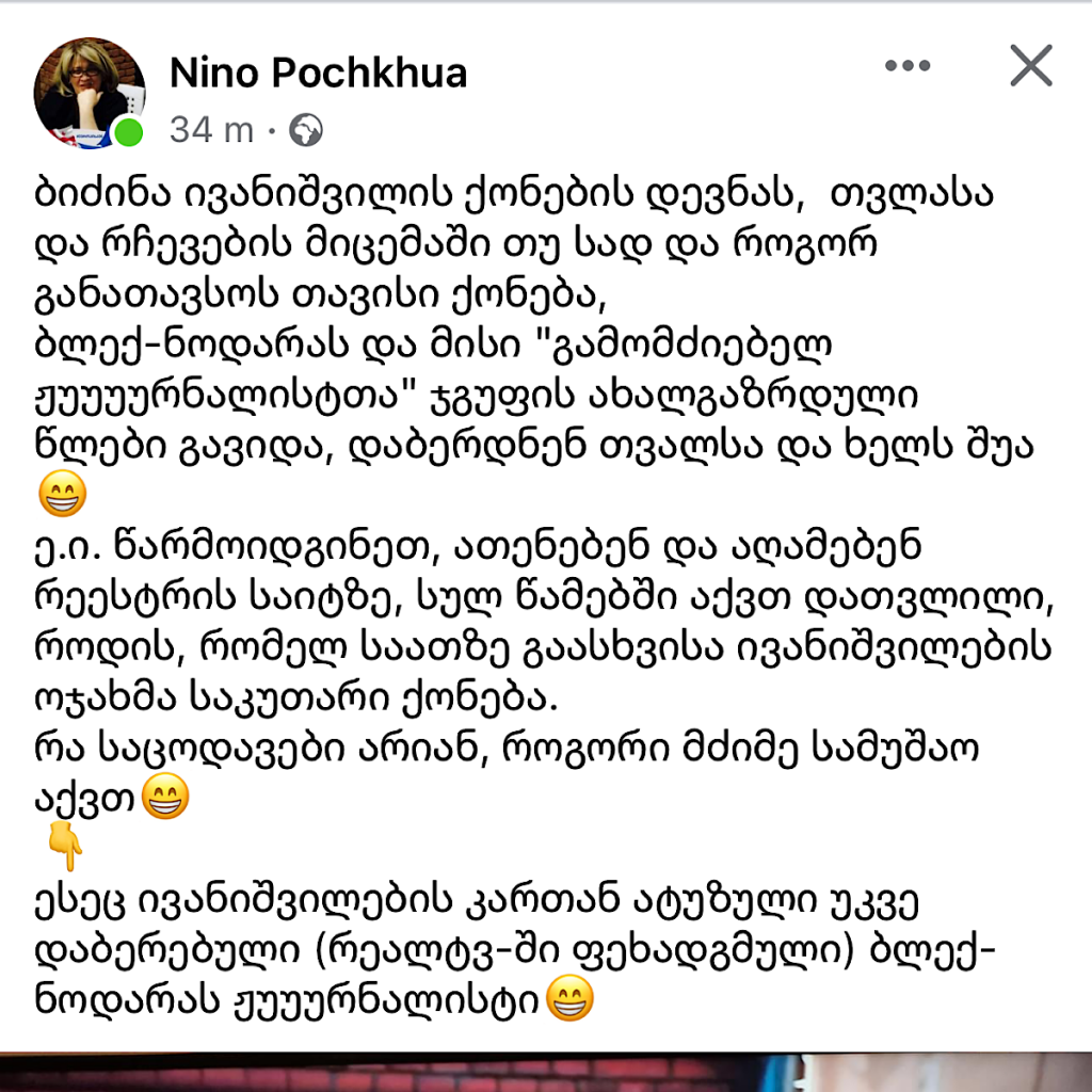 ნინო ფოჩხუა სოციალურ ქსელში პოსტს აქვეყნებს.