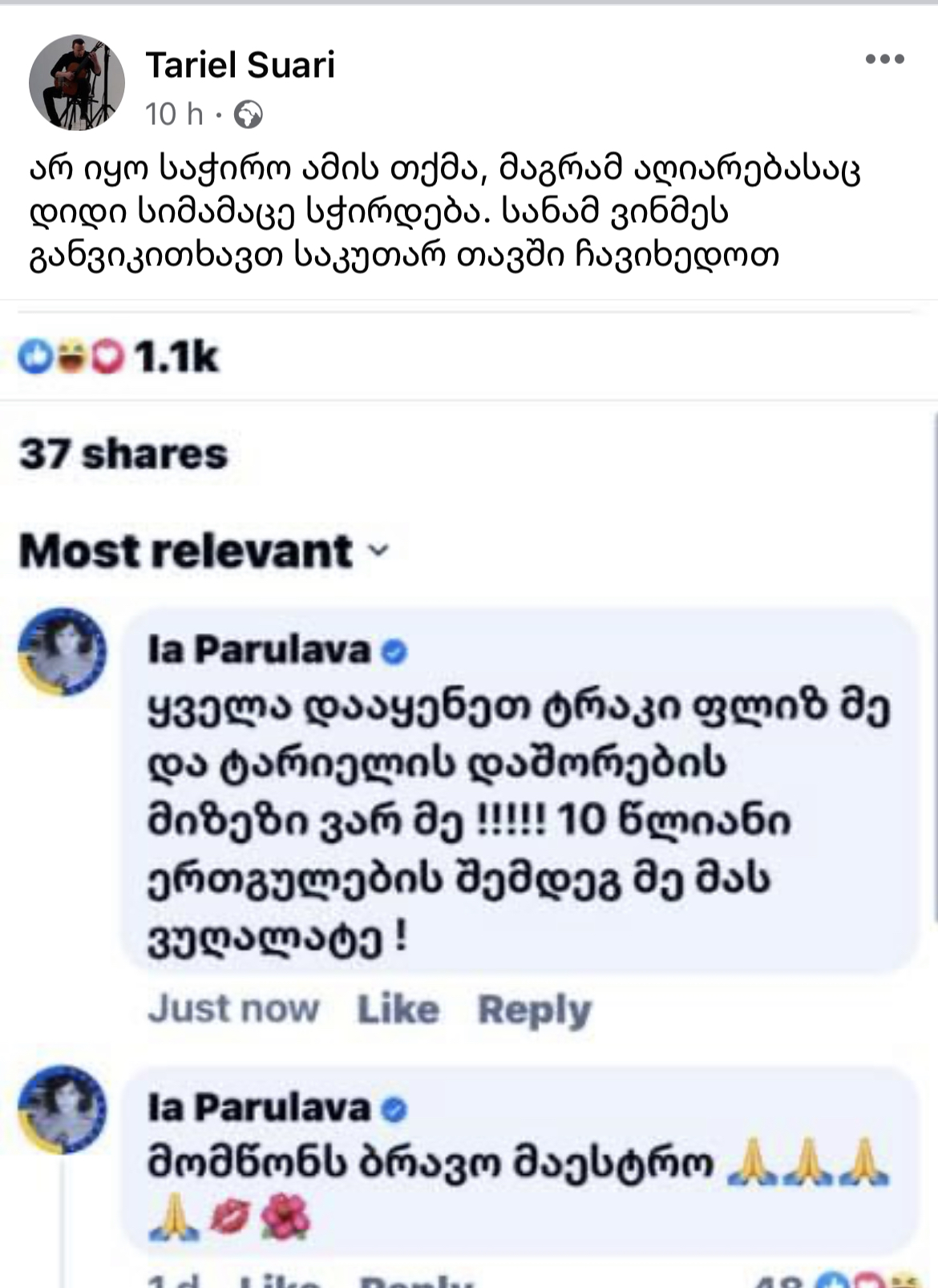 რაც შეეხება ია ფარულავას აღიარებითი კომენტარის სქრინს, მასში აღნიშნულია, რომ მათი დაშორების მიზეზი, ია ფარულავას მხრიდან ღალატი გახდა.