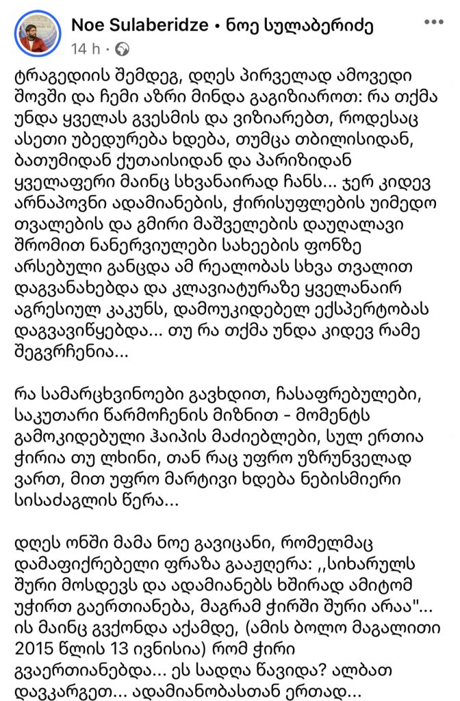 პროდიუსერი ნოე სულაბერიძე სოციალურ ქსელში შოვის ტრაგედიასთან დაკავშირებით ემოციურ პოსტს აქვეყნებს.