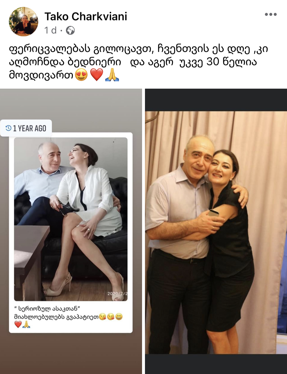 „აგერ უკვე 30 წელია მოვდივართ“: თაკო ჩარკვიანმა და მისმა მეუღლემ ქორწინების იუბილე აღნიშნეს საზოგადოებასლაიდერი By editor გამოქვეყნდა 20.08.2023 293 გაზიარება თაკო ჩარკვიანმა და მისმა მეუღლემ, ჯონი გიგანმა ქორწინების 30 წლის იუბილე აღნიშნეს. ამის შესახებ ჩარკვიანი სოციალურ ქსელში წერს და აღნიშნავს, რომ ფერიცვალების დღესასწაული მათთვის განსაკუთრებით ბედნიერი აღმოჩნდა. „ფერიცვალებას გილოცავთ, ჩვენთვის ეს დღე, კი აღმოჩნდა ბედნიერი და აგერ უკვე 30 წელია მოვდივართ“ – წერს თაკო ჩარკვიანი. 293 გაზიარება