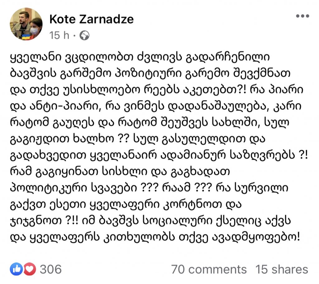 “ყველა ვცდილობთ, ძლივს გადარჩენილი ბავშვის გარშემო პოზიტიური გარემო შევქმნათ და თქვე უსისხლოებო რეებს აკეთებთ?! რა პიარი და ანტი-პიარი, რა ვინმეს დადანაშაულება, კარი რატომ გაუღეს და რატომ შეუშვეს სახლში? – სულ გაგიჟდით ხალხო?? სულ გასულელდით და გადახვედით ყველანაირ ადამიანურ საზღვრებს ?! რამ გაგიყინათ სისხლი და გაგხადათ პოლიტიკური სვავები? რამ? რა სურვილი გაქვთ ასეთი, ყველაფერი კორტნოთ და ჯიჯგნოთ?! იმ ბავშვს სოციალური ქსელიც აქვს და ყველაფერს კითხულობს თქვე ავადმყოფებო!”- წერს კონსტანტინე ზარნაძე ფეისბუქის პროფილზე.