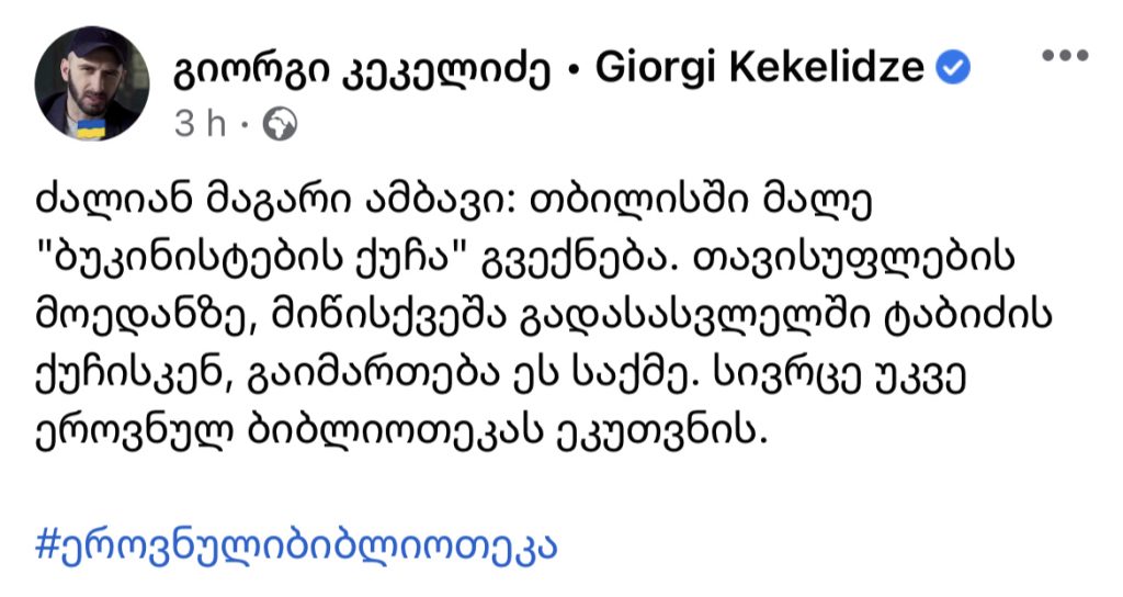 “ძალიან მაგარი ამბავი: თბილისში მალე “ბუკინისტების ქუჩა” გვექნება. თავისუფლების მოედანზე, მიწისქვეშა გადასასვლელში ტაბიძის ქუჩისკენ, გაიმართება ეს საქმე. სივრცე უკვე ეროვნულ ბიბლიოთეკას ეკუთვნის.