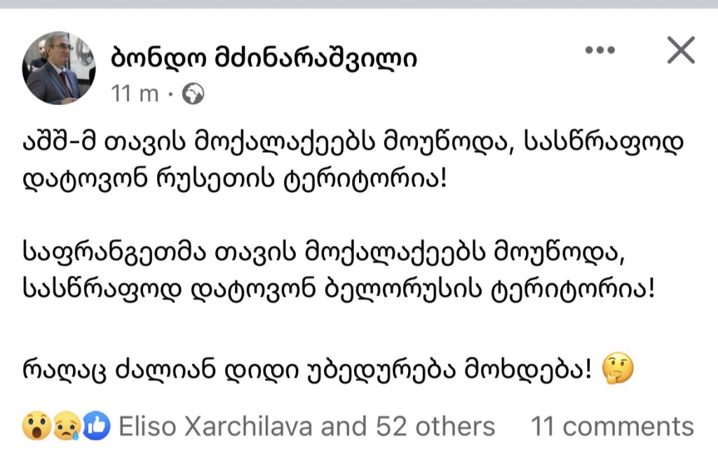 ჟურნალისტი ბონდო მძინარაშვილი სოციალურ ქსელში პოსტს აქვეყნებს.