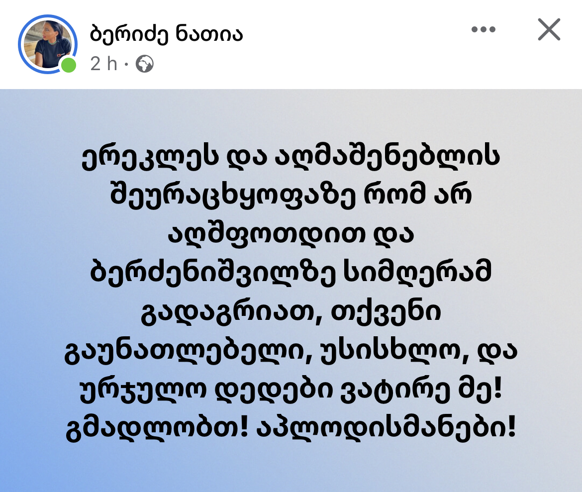 “თქვენი გაუნათლებელი, უსისხლო, და ურჯულო დედები ვატირე მე!” საზოგადოებასლაიდერი By editor გამოქვეყნდა 07.05.2023 247 გაზიარება ჟურნალისტი ნათია ბერიძე სოციალურ ქსელში პოსტს აქვეყნებს. “ერეკლეს და აღმაშენებლის შეურაცხყოფაზე რომ არ აღშფოთდით და ბერძენიშვილზე სიმღერამ გადაგრიათ, თქვენი გაუნათლებელი, უსისხლო, და ურჯულო დედები ვატირე მე! გმადლობთ! აპლოდისმანები!”-წერს ბერიძე. 247 გაზიარება