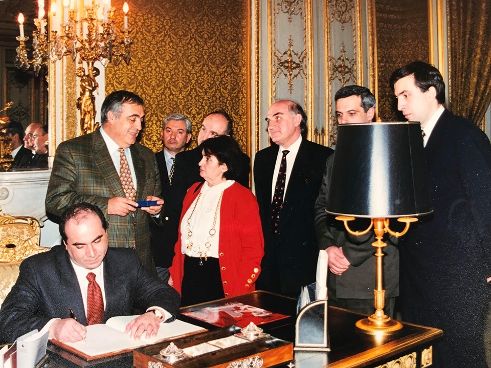 ფოტოს არაფერი აწერია. კონკრეტულად, რა შეხვედრაა, არ ვიცი, მაგრამ ჩემი აზრით, უნდა იყოს 1996 წელი, პარიზი. არ უნდა ვცდებოდე. მაშინ, ლევილის საკითხზე ჩავიდა საპარლამენტო დელეგაცია, ზურაბ ჟვანია პარლამენტის თავმჯდომარე იყო, მამაჩემი – მიგრაციისა და უცხოეთში მცხოვრებ თანამემამულეთა საქმეების კომიტეტის თავმჯდომარე. დელეგაციაში სააკაშვილი და ლანა ღოღობერიძე არ ყოფილან. ალბათ, ამ რაღაც შეხვედრაზე მივიდნენ. აქვე ვხედავთ საქართველოს მაშინდელ ელჩს საფრანგეთში – გოჩა ჩოგოვაძეს. ასევე, გია კობახიძეს, რომელიც მე ძალიან მიყვარს და მის შვილზე გაბოროტებულები, აქ ნუ შემოვარდებით. საერთოდ, ფოტოს ისტორიისთვის ვაქვეყნებ, არ ატეხოთ წყევლა-კრულვა არავის მიმართ,“ – წერს რუსუდან შარაძე.