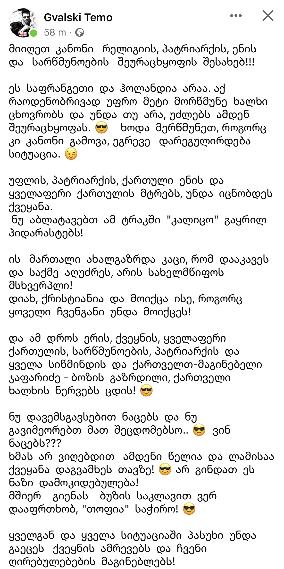 “მიიღეთ კანონი რელიგიის, პატრიარქის, ენის და სარწმუნოების შეურაცხყოფის შესახებ!!!
