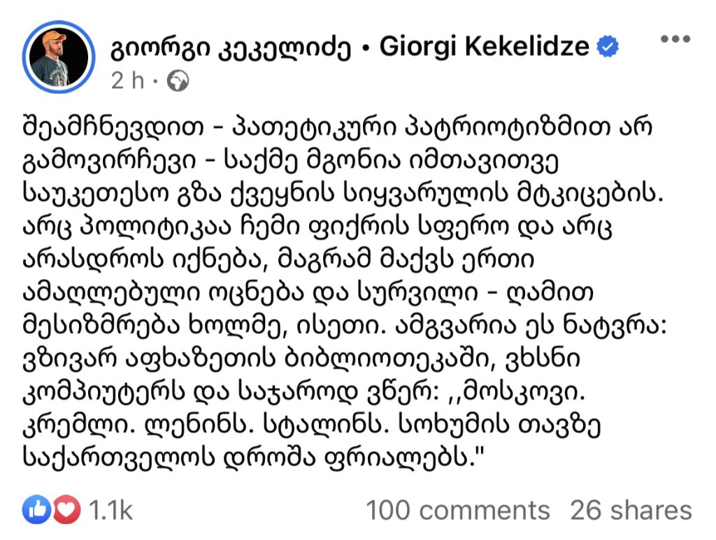 არც პოლიტიკაა ჩემი ფიქრის სფერო და არც არასდროს იქნება, მაგრამ მაქვს ერთი ამაღლებული ოცნება და სურვილი – ღამით მესიზმრება ხოლმე, ისეთი. ამგვარია ეს ნატვრა: ვზივარ აფხაზეთის ბიბლიოთეკაში, ვხსნი კომპიუტერს და საჯაროდ ვწერ: ,,მოსკოვი. კრემლი. ლენინს. სტალინს. სოხუმის თავზე საქართველოს დროშა ფრიალებს“, – წერს გიორგი კეკელიძე სოციალურ ქსელში.