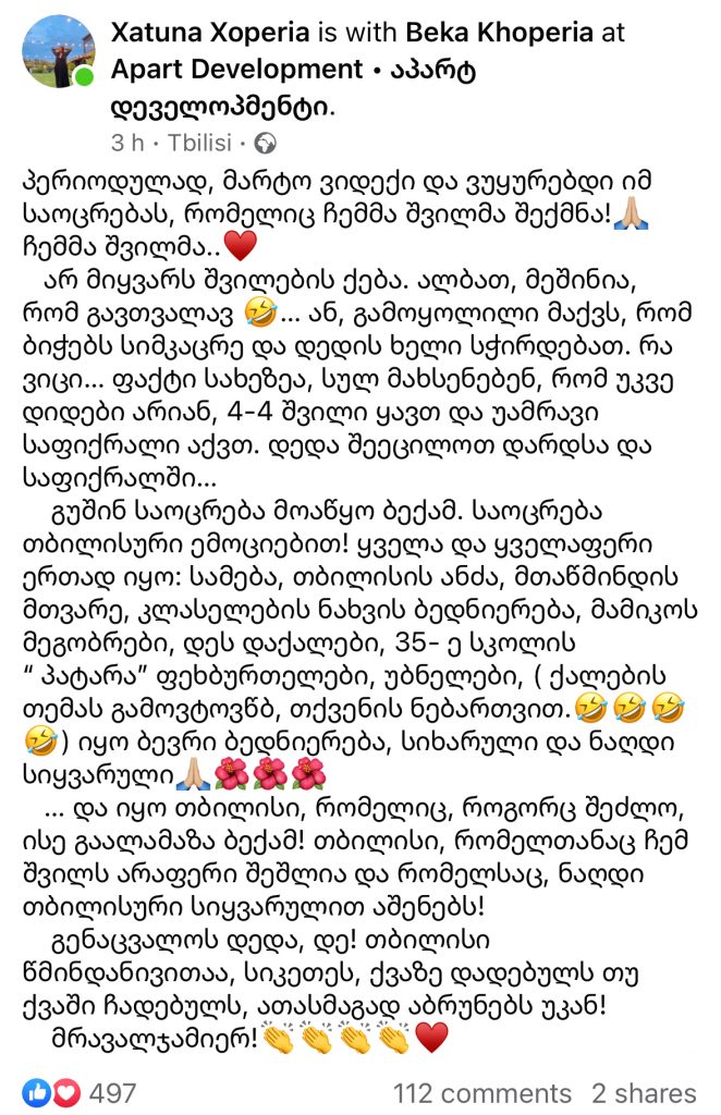… და იყო თბილისი, რომელიც, როგორც შეძლო, ისე გაალამაზა ბექამ! თბილისი, რომელთანაც ჩემ შვილს არაფერი შეშლია და რომელსაც, ნაღდი თბილისური სიყვარულით აშენებს!