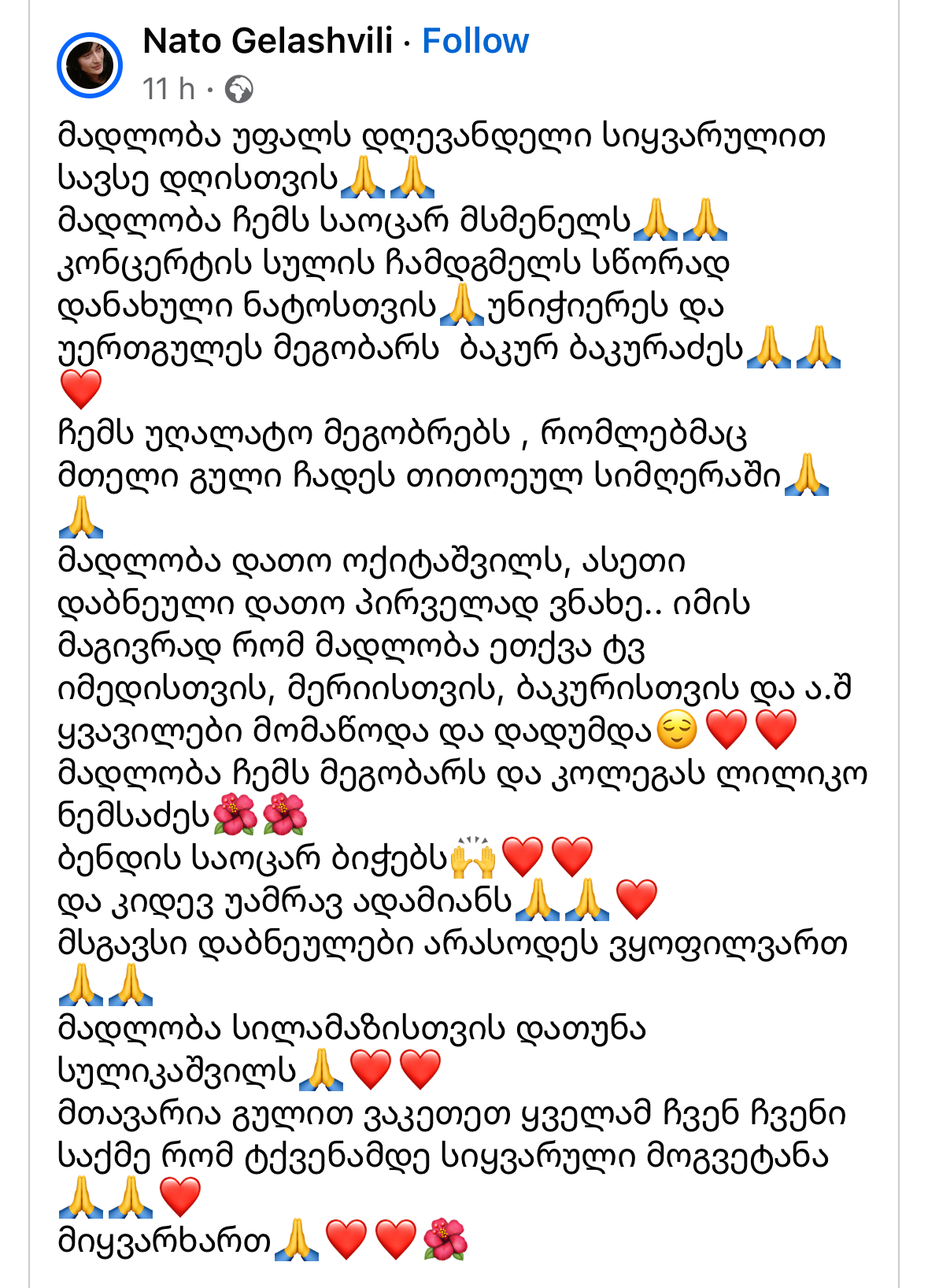 ნატო გელაშვილი სოციალურ ქსელში პოსტს აქვეყნებს.