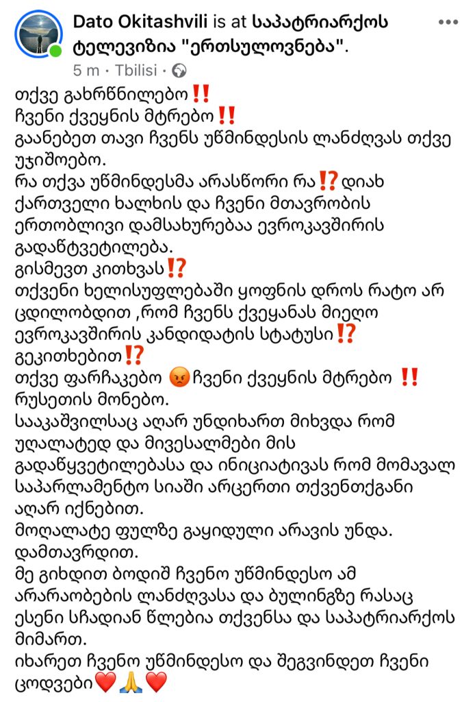 კულტურის პალატის პრეზიდენტი დათო ოქიტაშვილი სოციალურ ქსელში პოსტს აქვეყნებს.