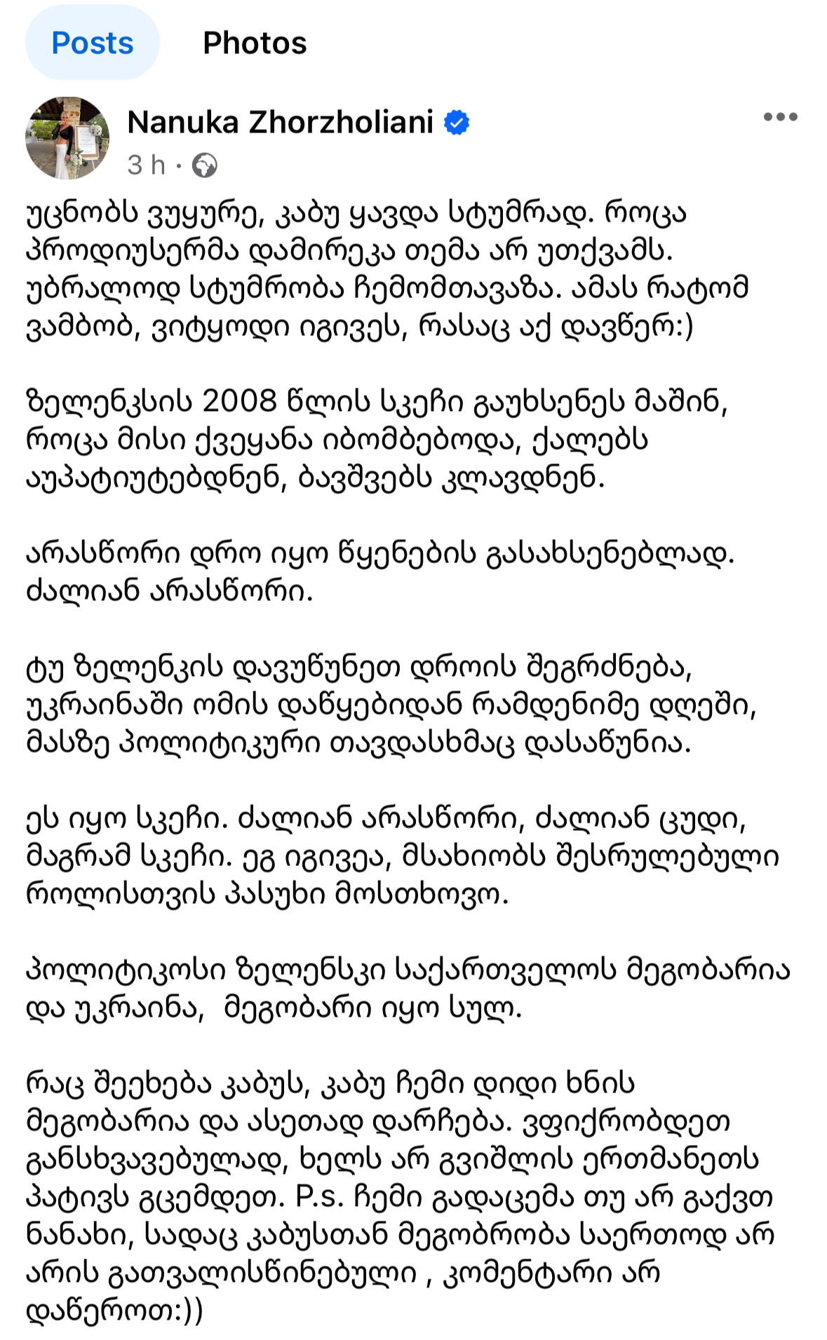 ნანუკა ჟორჟოლიანი სოციალურ ქსელში პოსტს აქვეყნებს.