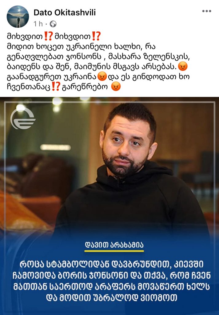 მიდით ხოცეთ უკრაინელი ხალხი, რა გენაღვლებათ ჯონსონს, მასხარა ზელენსკის, ბაიდენს და შენ, მაიმუნის მსგავს არსებას.😡გაანადგურეთ უკრაინა😡და ეს გინდოდათ ხო ჩვენთანაც⁉️გარეწრებო 😡”