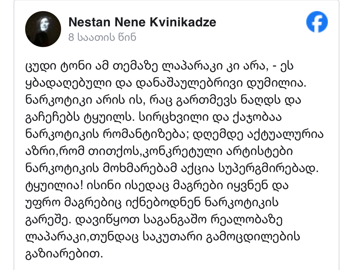 მწერალი და ჟურნალისტი, ნესტან ნენე კვინიკაძე, სოციალურ ქსელში, ნარკოტიკებთან და ნარკომომხმარებლებთან დაკავშირებით პოსტს აქვეყნებს.