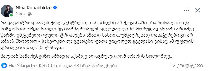 “რა კატასტროფააა ეს ქოლ ცენტრები, თან ამდენი ამ ქვეყანაში…რა მორალით და სინდისით უნდა მიიღო ეგ თანხა რომელსაც ვიღაც უცხო მოხუც ადამიანს ართმევ… წარმოუდგენელი ფული ტრიალებს ამათი სახით…უმკაცრესად დასაჭერები კი არ არიან მხოლოდ – სახელები და გვარები უბდა ვიცოდეთ ყველასი ვისაც ამ ფულის ფრიალით თავი მოქონდა…
