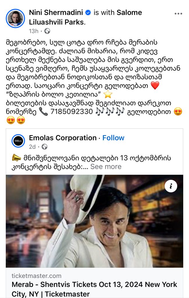 ნინი შერმადინი სოციალურ ქსელში აქვეყნებს მერაბ სეფაშვილის ამერიკული კონცერტის შესახებ ბმულს და აღნიშნავს, რომ ღონისძიებამდე, სადაც თავადაც მონაწილეობს, ცოტა დრო რჩება. კონცერტი 13 ოქტომბერს შედგება, ბილეთები კი ჯერ კიდევ იყიდება: