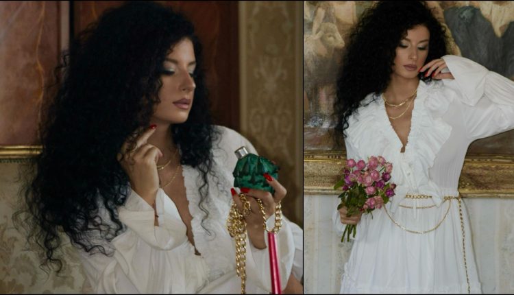 თეთრ ლუქში გამოწყობილი ეკატერინე თვალისმომჭრელად გამოიყურება.