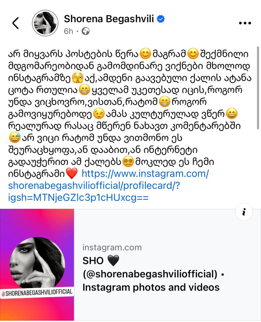 „არ მიყვარს პოსტების წერა, მაგრამ შექმნილი მდგომარეობიდან გამომდინარე ვიქნები მხოლოდ „ინსტაგრამზე“. აქ ამდენი გაავებული ქალის ატანა ცოტა რთულია. ყველამ უკეთესად იცის, როგორ უნდა ვიცხოვრო, ვისთან, რატომ, როგორ გამოვიყურებოდე. ამას კულტურულად ვწერ. რეალურად რასაც მწერენ ნახავთ კომენტარებში. არ ვიცი რატომ უნდა ვითმინო ეს შეურაცხყოფა, ან დააბით, ან ინტერნეტი გადაუჭერით ამ ქალებს. მოკლედ ეს ჩემი ინსტაგრამი,“ – წერს შორენა და საკუთარ „ინსტაგრამ“ გვერდს გვიზიარებს