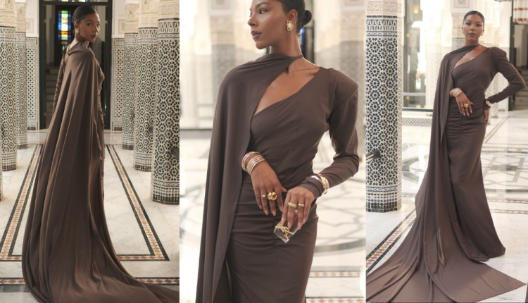 მარიამ სანოგო ულამაზეს, მუქ ყავისფერ კაბაში პოზირებს. მოდელი შეუდარებლად გამოიყურება.