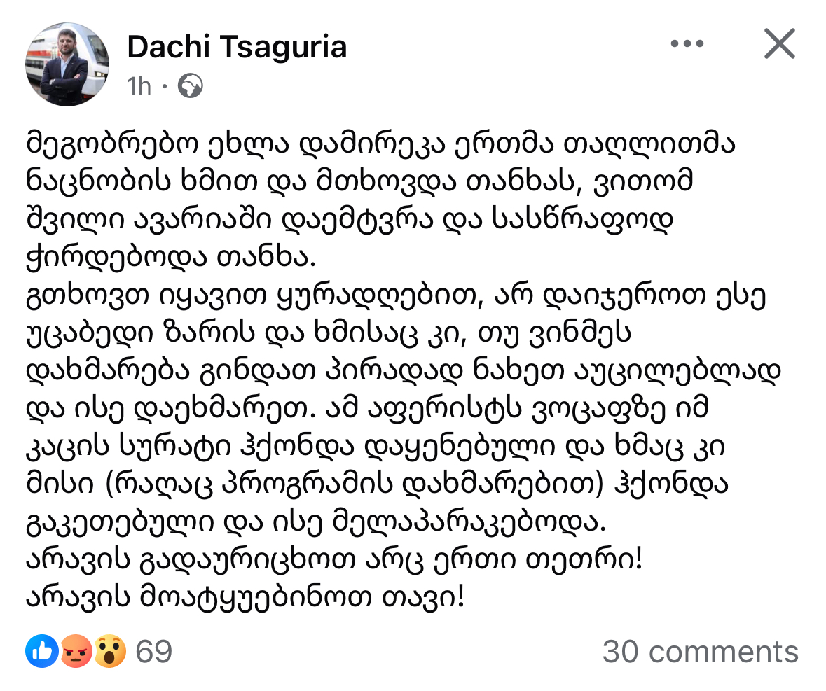 ”მეგობრებო ეხლა დამირეკა ერთმა თაღლითმა ნაცნობის ხმით და მთხოვდა თანხას, ვითომ შვილი ავარიაში დაემტვრა და სასწრაფოდ ჭირდებოდა თანხა.