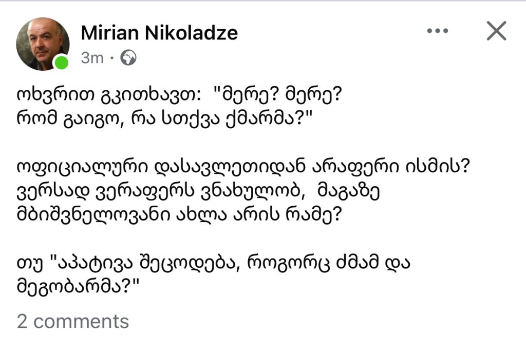 ადვოკატი მირიან ნიკოლაძე სოციალურ ქსელში პოსტს აქვეყნებს.