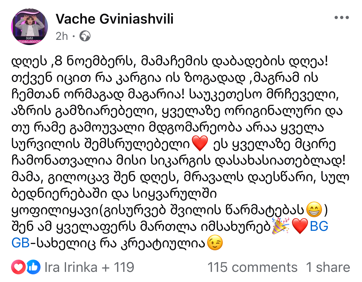 ამის შესახებ ვაჩე სოციალურ ქსელში წერს და მამას დაბადების დღეს ემოციური სიტყვებით ულოცავს.