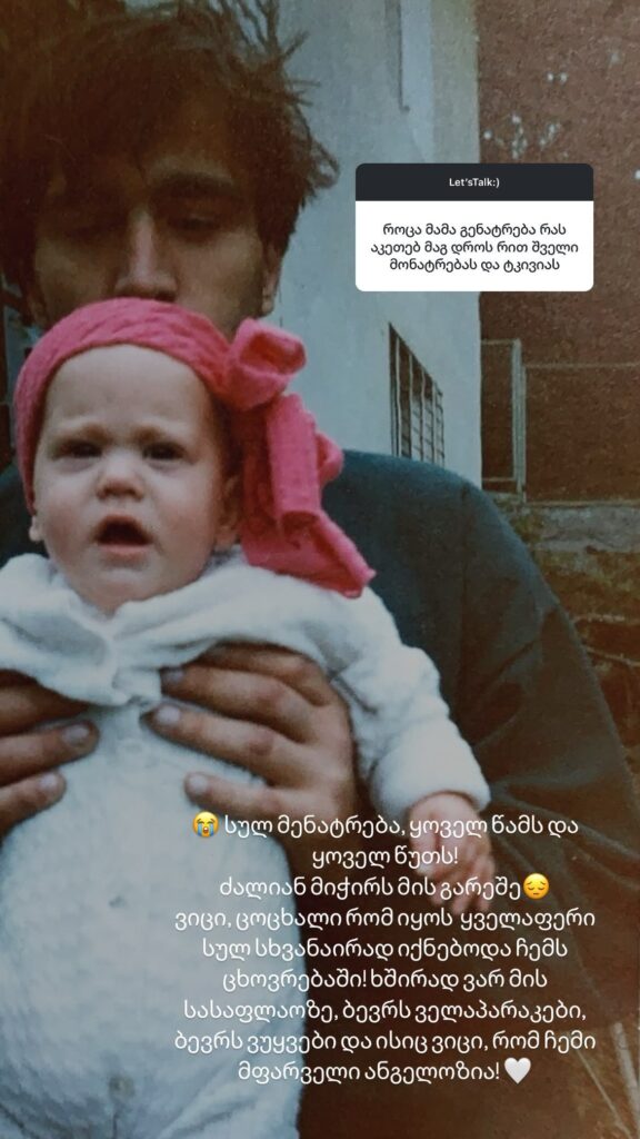 „სულ მენატრება, ყოველ წამს და ყოველ წუთს! ძალიან მიჭირს მის გარეშე. ვიცი, ცოცხალი რომ იყოს ყველაფერი სულ სხვანაირად იქნებოდა ჩემს ცხოვრებაში! ხშირად ვარ მის სასაფლაოზე, ბევრს ველაპარაკები, ბევრს ვუყვები და ისიც ვიცი, რომ ჩემი მფარველი ანგელოზია“ – წერს ნინი ქარსელაძე „ინსტაგრამის“ „სთორიში“.