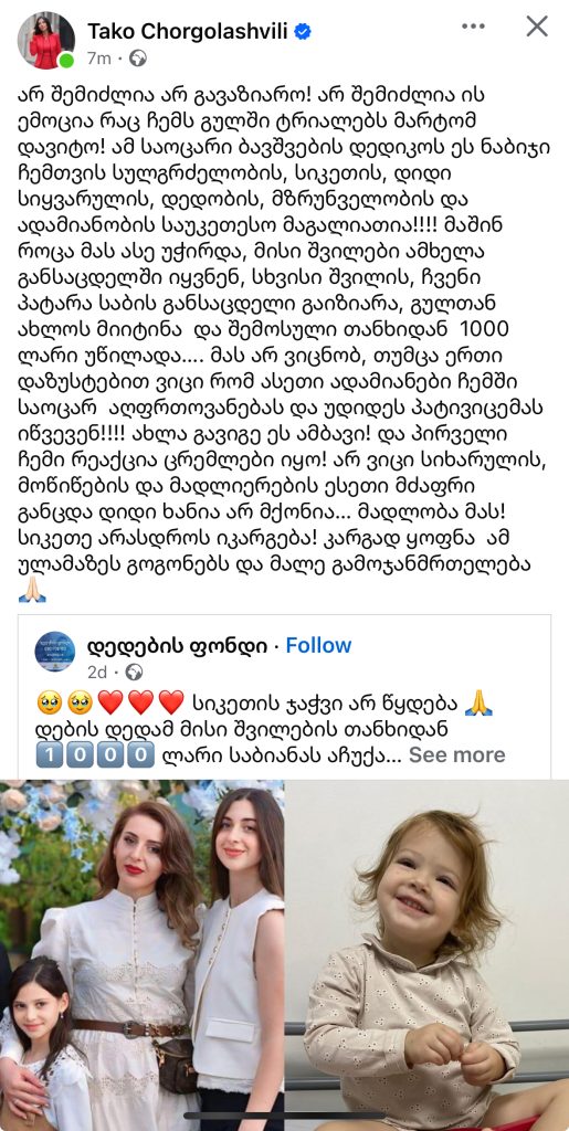 ”არ შემიძლია არ გავაზიარო! არ შემიძლია ის ემოცია რაც ჩემს გულში ტრიალებს მარტომ დავიტოვო! ამ საოცარი ბავშვების დედიკოს ეს ნაბიჯი ჩემთვის სულგრძელობის, სიკეთის, დიდი სიყვარულის, დედობის, მზრუნველობის და ადამიანობის საუკეთესო მაგალიათია!!!! მაშინ როცა მას ასე უჭირდა, მისი შვილები ამხელა განსაცდელში იყვნენ, სხვისი შვილის, ჩვენი პატარა საბის განსაცდელი გაიზიარა, გულთან ახლოს მიიტინა და შემოსული თანხიდან 1000 ლარი უწილადა…. მას არ ვიცნობ, თუმცა ერთი დაზუსტებით ვიცი რომ ასეთი ადამიანები ჩემში საოცარ აღფრთოვანებას და უდიდეს პატივიცემას იწვევენ!!!! ახლა გავიგე ეს ამბავი! და პირველი ჩემი რეაქცია ცრემლები იყო! არ ვიცი სიხარულის, მოწიწების და მადლიერების ესეთი მძაფრი განცდა დიდი ხანია არ მქონია… მადლობა მას! სიკეთე არასდროს იკარგება! კარგად ყოფნა ამ ულამაზეს გოგონებს და მალე გამოჯანმრთელება🙏🏻”