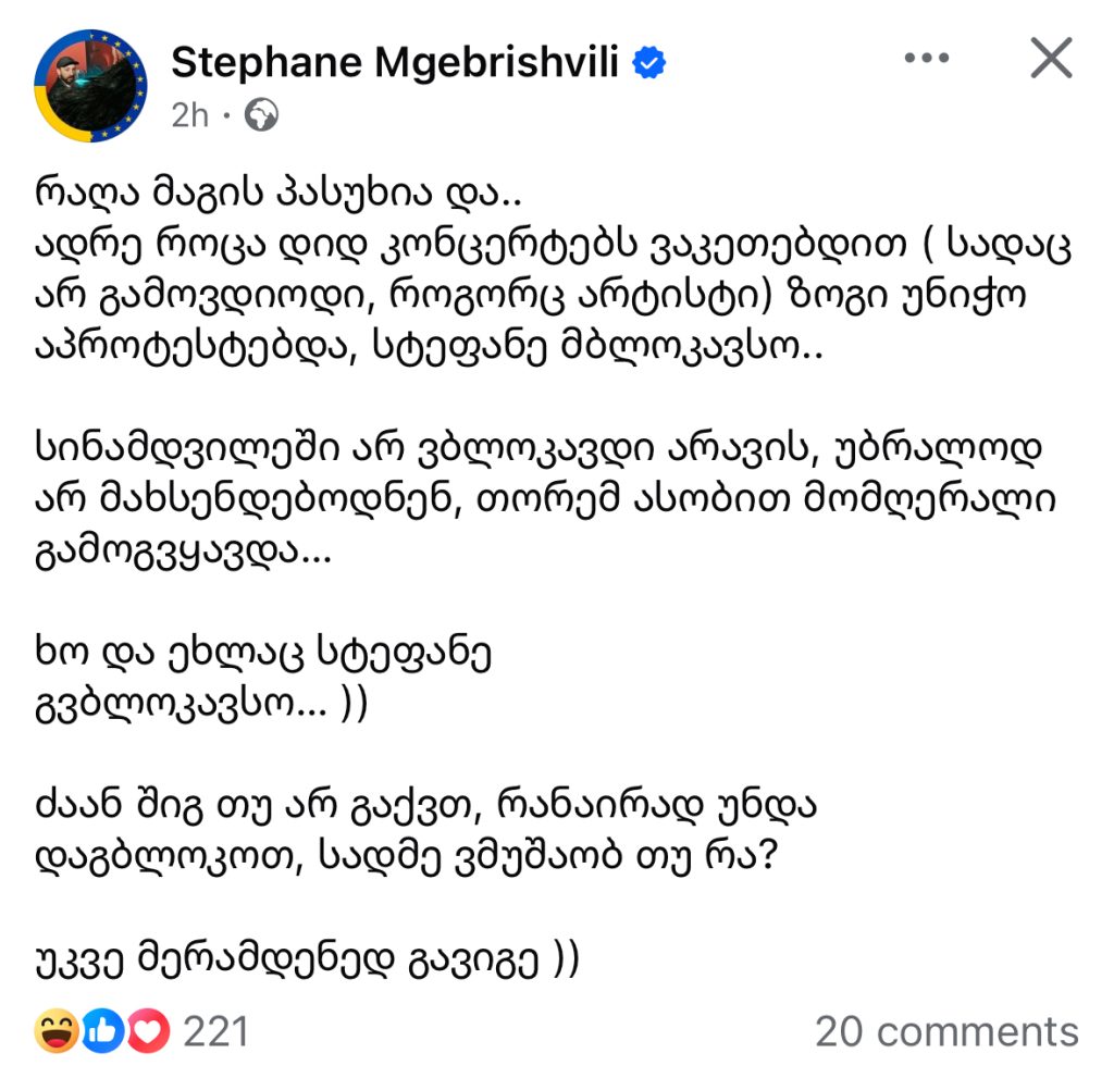 სტეფანე სოციალურ ქსელში პოსტს აქვეყნებს.