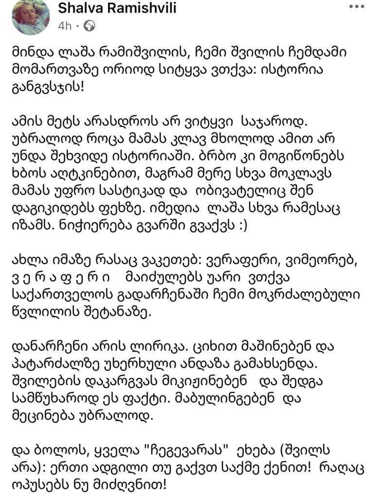 „მინდა ლაშა რამიშვილის, ჩემი შვილის ჩემდამი მომართვაზე ორიოდ სიტყვა ვთქვა: ისტორია განგვსჯის! ამის მეტს არასდროს არ ვიტყვი საჯაროდ. უბრალოდ როცა მამას კლავ მხოლოდ ამით არ უნდა შეხვიდე ისტორიაში. ბრბო კი მოგიწონებს ხბოს აღტკინებით, მაგრამ მერე სხვა მოკლავს მამას უფრო სასტიკად და ობივატელიც შენ დაგიკიდებს ფეხზე. იმედია ლაშა სხვა რამესაც იზამს. ნიჭიერება გვარში გვაქვს