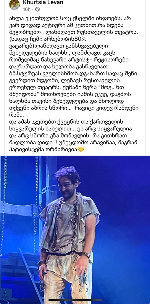 რუსთაველის თეატრის მსახიობი ლევან ხურცია სოციალურ ქსელში პოსტს აქვეყნებს.