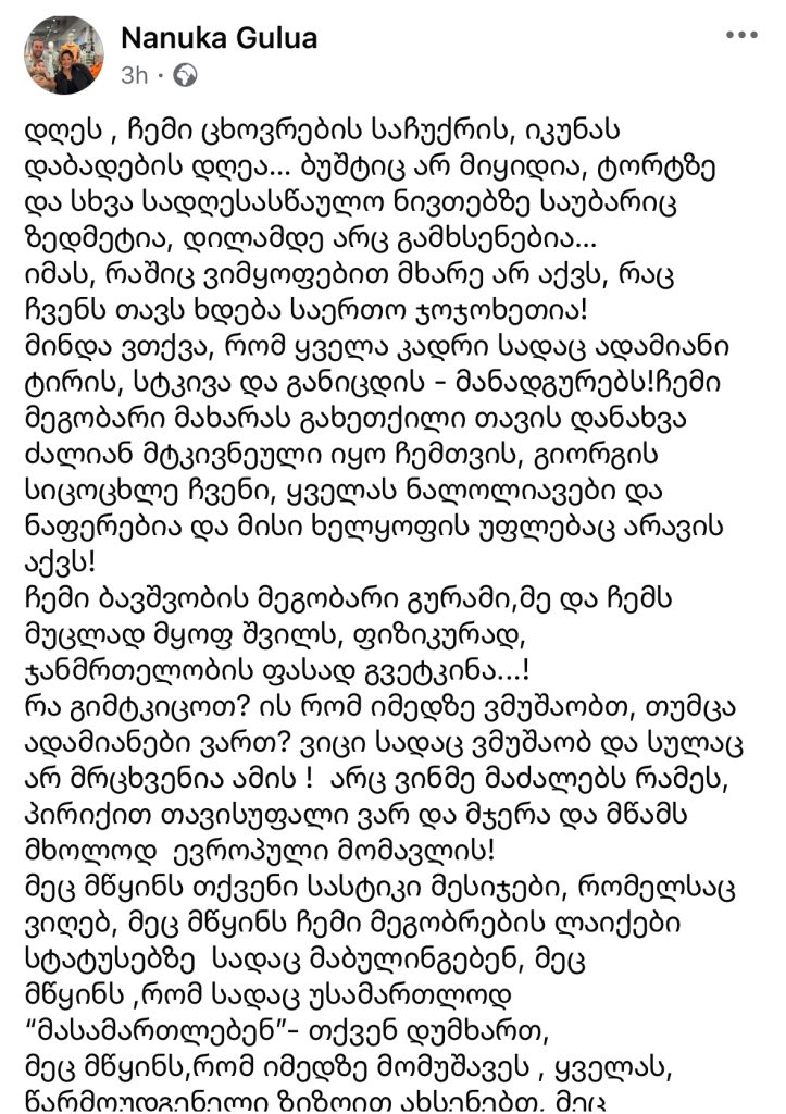 მეგობრებო ,დღეს თუ ხვალ ყველაფერი დასრულდება, დავმშვიდდებით,დავწყნარდებით და ვეცადოთ სახე ისე არ დავკარგოთ ,რომ ერთმანეთს თვალებში ვეღარ შევხედოთ … ღმერთო დაგვიფარე გთხოვ!“, – წერს ნანუკა გულუა სოციალურ ქსელში.