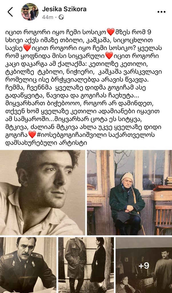 ”იცით როგორი იყო ჩემი სოსიკო❤️მზეს რომ 9 სხივი აქვს იმაზე თბილი, კაშკაშა, სიცოცხლით სავსე❤️იცით როგორი იყო ჩემი სოსიკო? ყველას რომ ყოფნიდა მისი სიყვარული❤️იცით როგორი კაცი დაკარგა ამ ქალაქმა: კეთილზე კეთილი, ტკბილზე ტკბილი, ნიჭიერი, კაშკაშა ვარსკვლავი რომელიც ისე ბრჭყვიალებდა არავის წვავდა. ჩემმა, ჩვენნმა ყველაზე დიდმა გოგიჩამ ასე გადაწყვიტა, წავიდა და გოგიჩას ჩაეხუტა… მიყვარხართ ბიჭებოოო, როგორ არ დამინდეთ, თქვენ ხომ ყველაზე კეთილი ადამიანები იყავით ამ სამყაროში…მიყვარხარ ცოტა ეს სიტყვა, მტკივა, ძალიან მტკივა ახლა უკვე ყველაზე დიდი გოგიჩა❤️#იოსებგოგიჩაიშვილი საქართველოს დამსახურებული არტისტი”