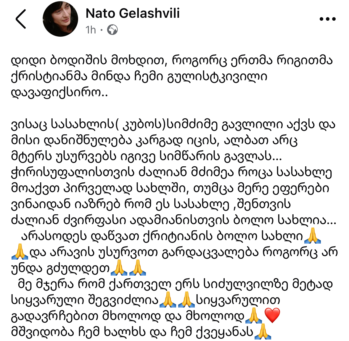მშვიდობა ჩემ ხალხს და ჩემ ქვეყანას🙏”