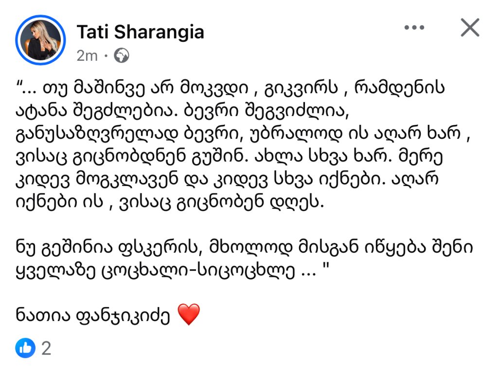 თათია შარანგია სოციალურ ქსელში პოსტს აქვეყნებს.