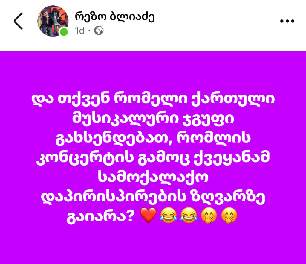 ”და თქვენ რომელი ქართული მუსიკალური ჯგუფი გახსენდებათ, რომლის კონცერტის გამოც ქვეყანამ სამოქალაქო დაპირისპირების ზღვარზე გაიარა? ❤️😂😂🤭🤭”