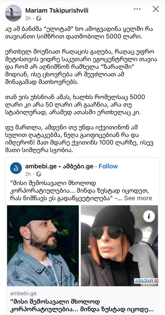 ”აუ ამ ბანძმა “ელიტამ” ხო ამოგვადინა ყელში რა თავიანთი სიმწრით დათმობილი 5000 ლარი.