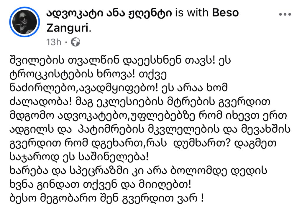 ხარება და სპეცრაზმი კი არა ბოლომდე დედის ხვნა გინდათ თქვენ და მიიღებთ! ბესო მეგობარო შენ გვერდით ვარ”, – წერს სოციალურ ქსელში ადვოკატი ანა ჟღენტი.