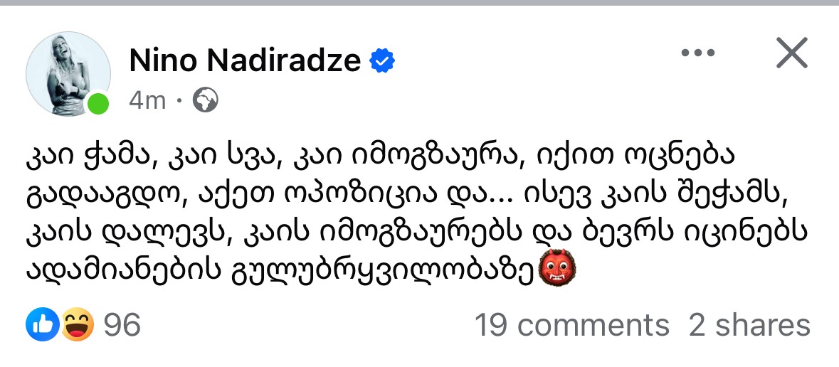 “ იქით ოცნება გადააგდო, აქეთ ოპოზიცია და…” საზოგადოებასლაიდერი By editor გამოქვეყნდა 29.12.2024 391 გაზიარება ნინო კუზანოვა სოციალურ ქსელში სალომე ზურაბიშვილის შესახებ წერს. “კაი ჭამა, კაი სვა, კაი იმოგზაურა, იქით ოცნება გადააგდო, აქეთ ოპოზიცია და… ისევ კაის შეჭამს, კაის დალევს, კაის იმოგზაურებს და ბევრს იცინებს ადამიანების გულუბრყვილობაზე👹” 391 გაზიარება