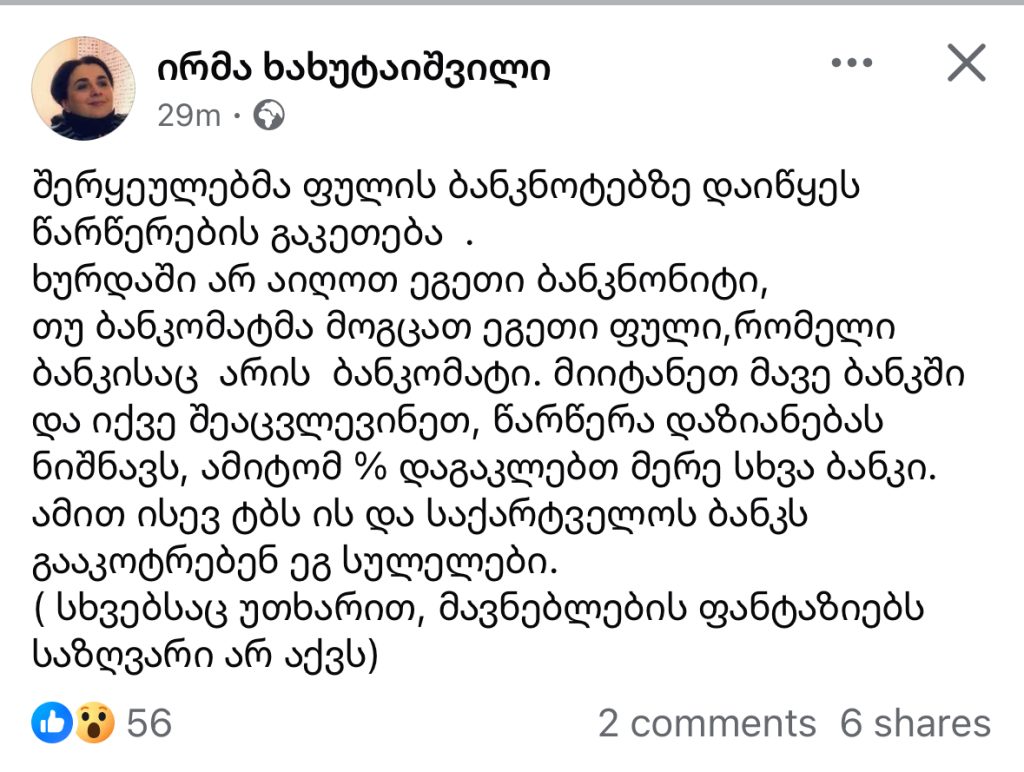 ირმა ხახუტაშვილი სოციალურ ქსელში პოსტს აქვეყნებს.