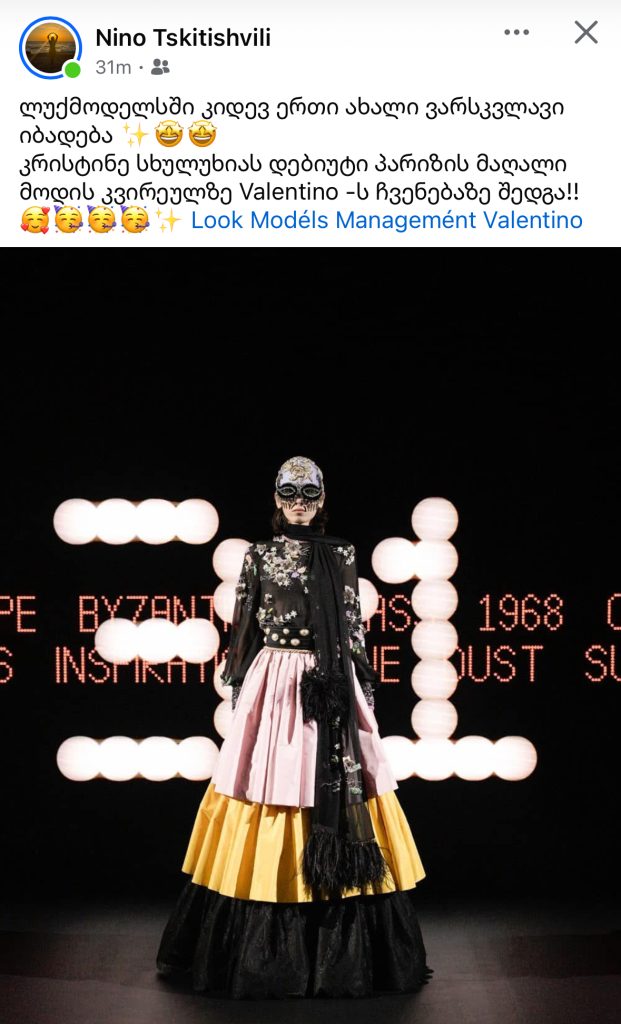 კრისტინე სხულუხიას დებიუტი პარიზის მაღალი მოდის კვირეულზე Valentino -ს ჩვენებაზე შედგა სლაიდერისოც.ქსელები By editor გამოქვეყნდა 29.01.2025 174 გაზიარება ნინო ცქიტიშვილი სოციალურ ქსელში პოსტს აქვეყნებს. ”ლუქმოდელსში კიდევ ერთი ახალი ვარსკვლავი იბადება ✨🤩🤩 კრისტინე სხულუხიას დებიუტი პარიზის მაღალი მოდის კვირეულზე Valentino -ს ჩვენებაზე შედგა!! 🥰🥳🥳🥳✨ Look Modéls Managemént Valentino” 174 გაზიარება