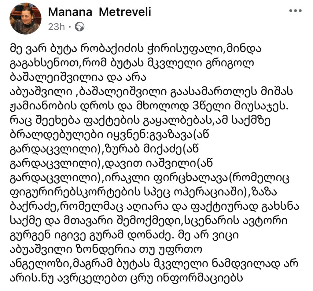 “მე ვარ ბუტა რობაქიძის ჭირისუფალი, მინდა გაგახსენოთ, რომ ბუტას მკვლელი გრიგოლ ბაშალეიშვილია და არა აბუაშვილი ბაშალეიშვილი გაასამართლეს მიშას ჟამიანობის დროს და მხოლოდ 3 წელი მიუსაჯეს.