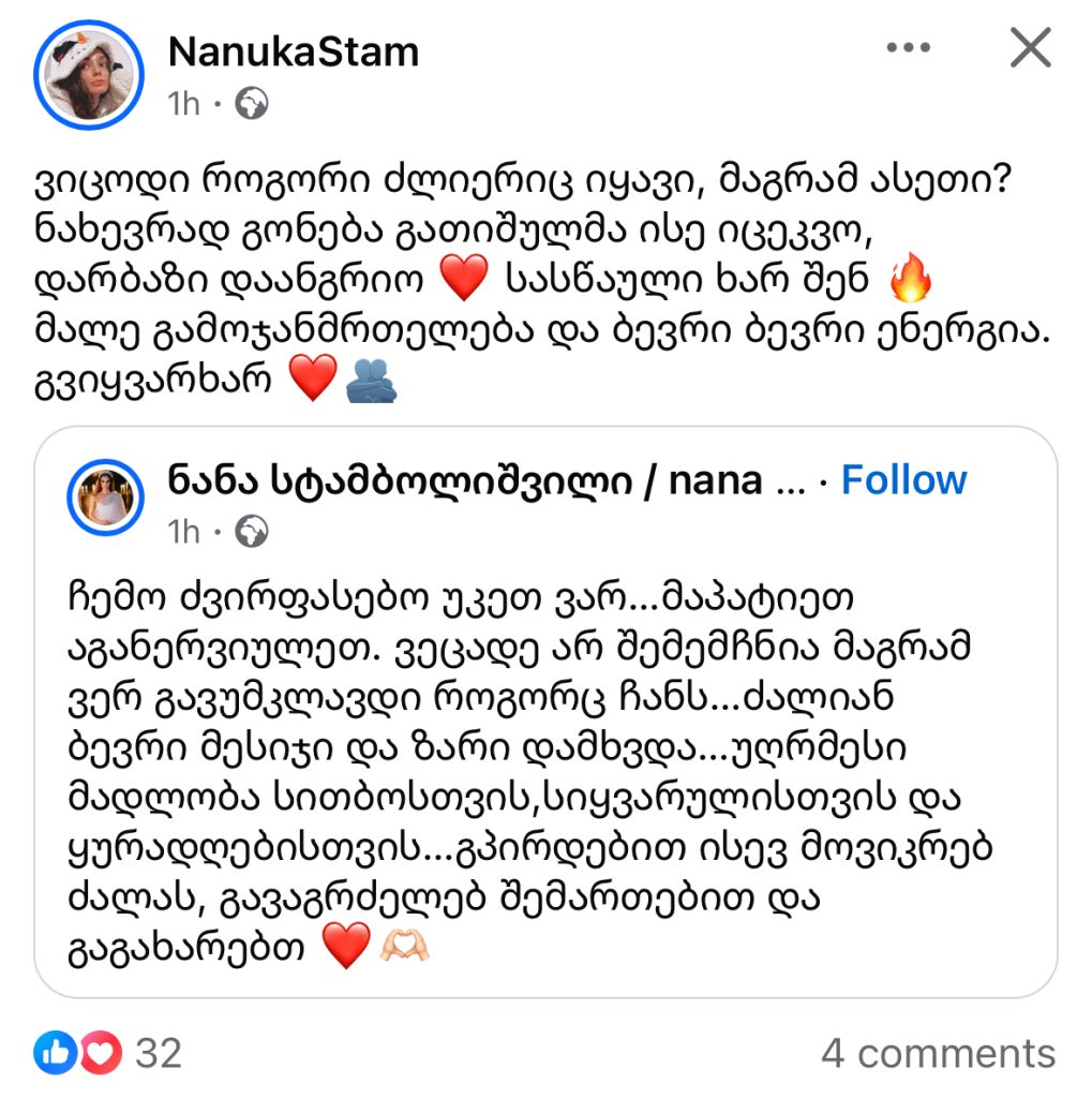 ”ჩემო ძვირფასებო უკეთ ვარ…მაპატიეთ აგანერვიულეთ. ვეცადე არ შემემჩნია მაგრამ ვერ გავუმკლავდი როგორც ჩანს…ძალიან ბევრი მესიჯი და ზარი დამხვდა…უღრმესი მადლობა სითბოსთვის,სიყვარულისთვის და ყურადღებისთვის…გპირდებით ისევ მოვიკრებ ძალას, გავაგრძელებ შემართებით და გაგახარებთ ❤️🫶🏻”