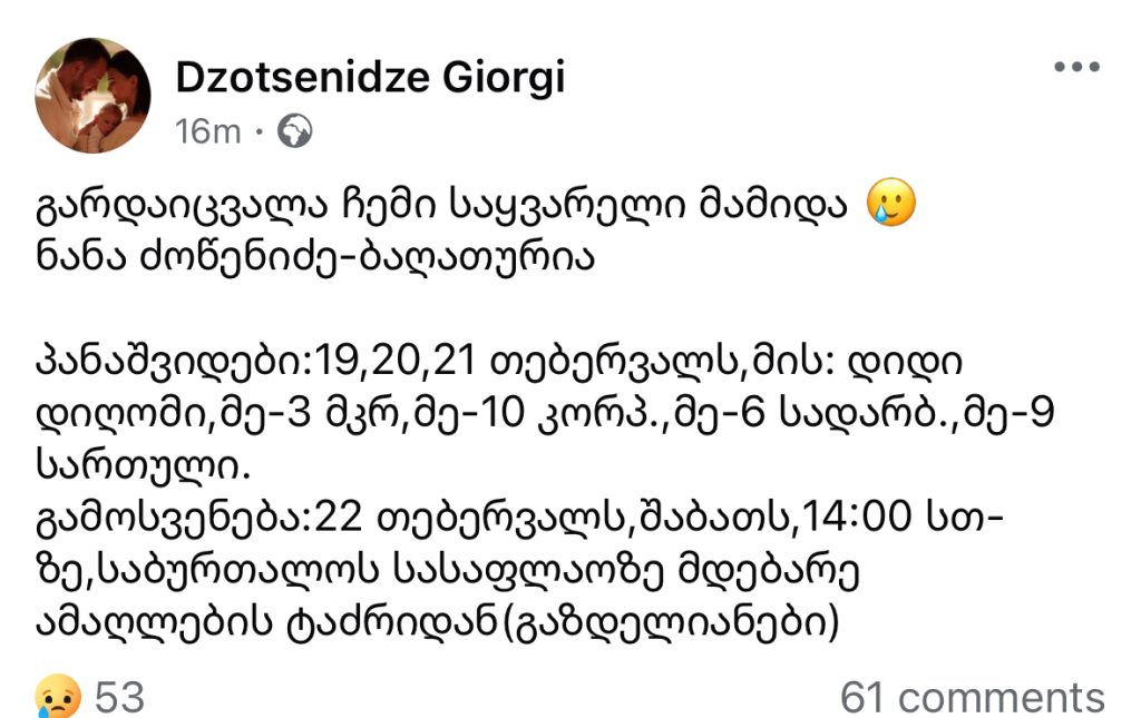გამოსვენება:22 თებერვალს,შაბათს,14:00 სთ-ზე,საბურთალოს სასაფლაოზე მდებარე ამაღლების ტაძრიდან(გაზდელიანები)”