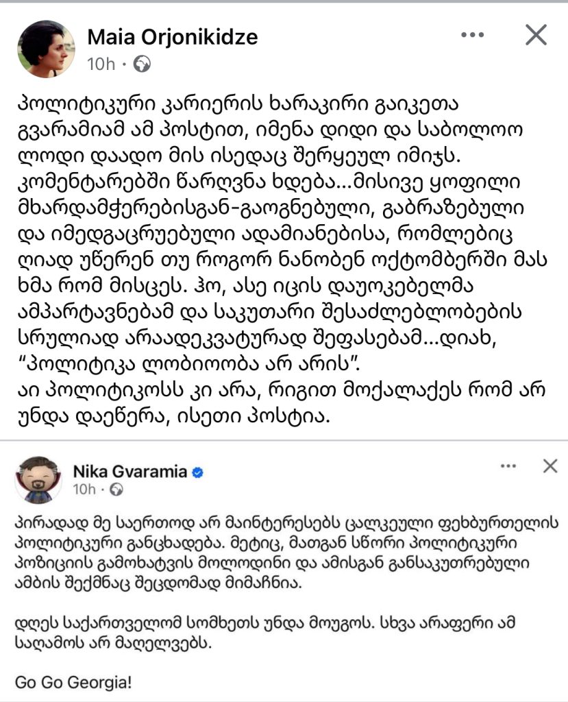 ”პოლიტიკური კარიერის ხარაკირი გაიკეთა გვარამიამ ამ პოსტით, იმენა დიდი და საბოლოო ლოდი დაადო მის ისედაც შერყეულ იმიჯს“