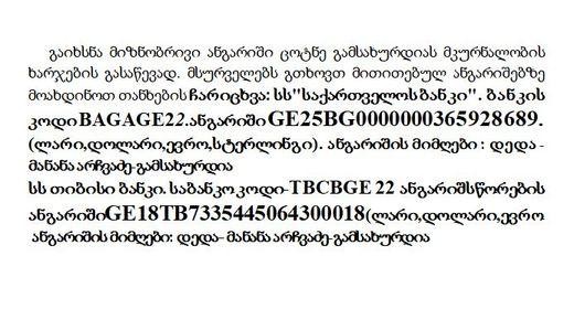 მანამდე ექსპრეზიდენტ ზვიად გამსახურდიას მეუღლემ მანანა არჩვაძე-გამსახურდიამ სოციალურ ქსელში ანგარიშის ნომერი გამოაქვეყნა და დაწერა, რომ თანხა მისი შვილის მკურნალობის ხარჯებს მოხმარდება.